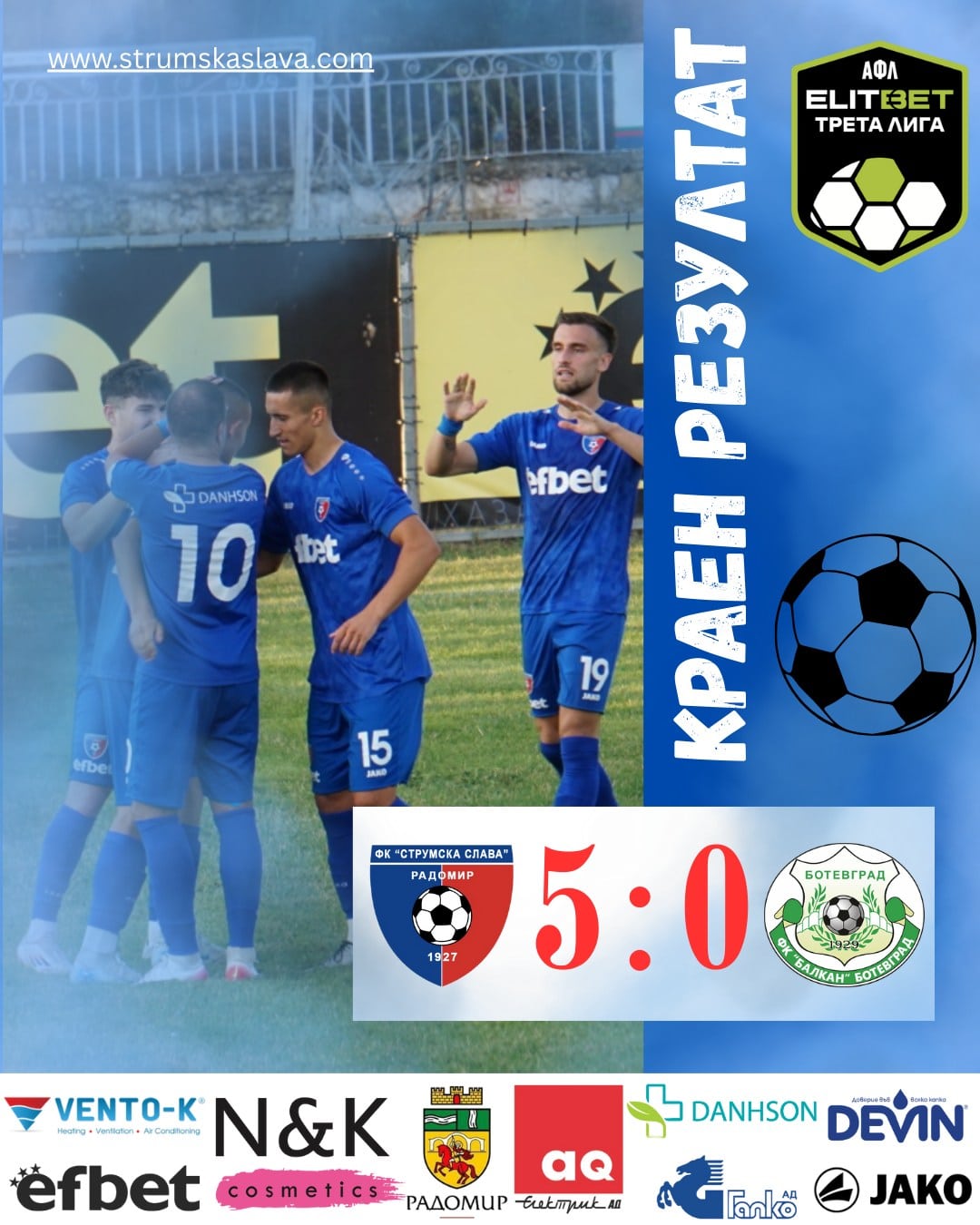 Струмска слава (Радомир) постигна убедителна победа с 5:0 над Балкан Ботевград в мач от третия кръг на Югозападната Трета лига. Това беше трети пореден успех и първа домакинска победа за Славата от началото на сезона.