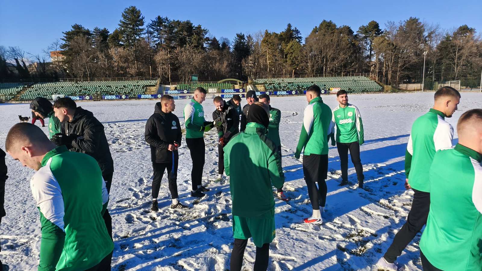 С водосвет и пожелания за здраве и успехи старши треньорът Радослав Джугданов изведе футболистите на заснежения терен за първо занимание.