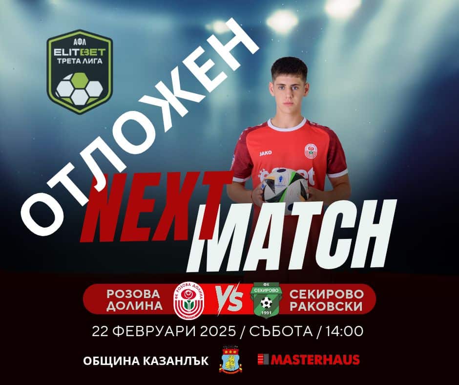 Гостуването на Секирово срещу Розова долина (Казанлък) е отменено. Мачът, който е част от програмата на 21-ия кръг в Югоизточната Трета лига, трябваше да се изиграе утре (22.02), но бе отложен за 5-и март.